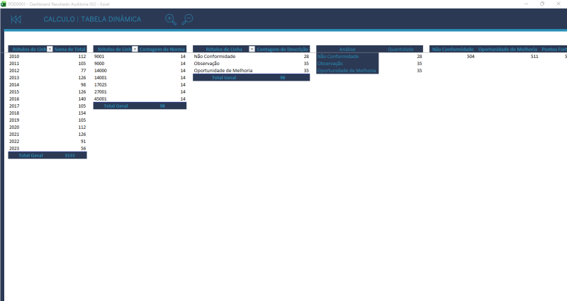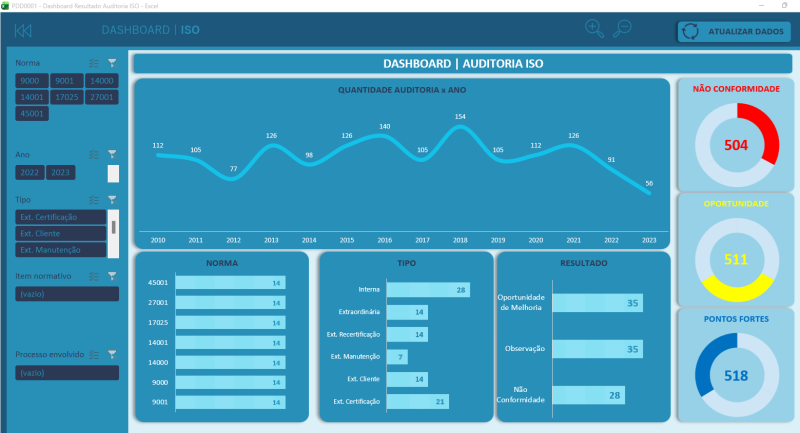 O "Dashboard Resultado Auditoria ISO" é uma ferramenta poderosa e intuitiva desenvolvida para empresas que desejam acompanhar, analisar e apresentar os resultados de auditorias internas e externas com base nas normas ISO (como ISO 9001, ISO 14001, ISO 45001, entre outras).
