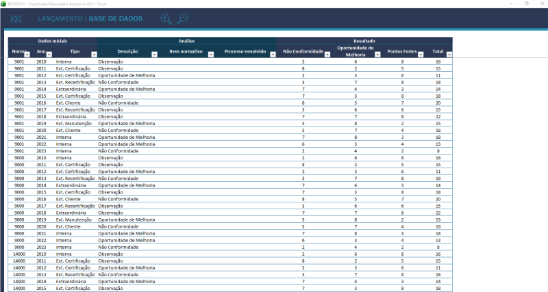 O "Dashboard Resultado Auditoria ISO" é uma ferramenta poderosa e intuitiva desenvolvida para empresas que desejam acompanhar, analisar e apresentar os resultados de auditorias internas e externas com base nas normas ISO (como ISO 9001, ISO 14001, ISO 45001, entre outras).